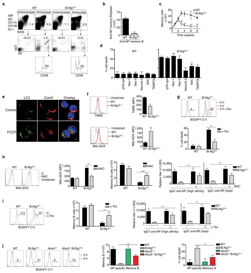 - Figure 4 Loss of memory B cells in the absence of Atg7 ( a , b ) DUMP - B220 + IgG1 + CD38 + NP + memory B cells in the spleen of B/ Atg7 -/- mice or WT controls eight weeks after immunization. Unimmunized mice were used as negative controls (a). Total NP-specific memory B cells in the spleen are presented in (b). ** P