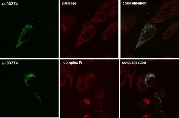 - Fig. 2 Ab93374 (Abcam) recognizes MPV17 specific structures in U2OS cells transiently transfected with an MPV17 expression construct in immunofluorescence analysis. Ab93374 signal ( green ) is largely missing in nontransfected cells. The immunoreactivity does colocalise with peroxisomal (anti-catalase, mouse polyclonal, Abcam ab88650) and mitochondrial (anti-complex IV mitochondrial subunit I, mouse monoclonal, Invitrogen 459600) markers ( red ). Immunofluorescence (IF) method was according to Pircher et al. [ 16 ] using a MicroRadiance confocal scanning system (Bio-Rad) in combination with a Zeiss Axiophot microscope. Colocalisation analysis was performed using the Fiji software of Image J and is illustrated by white dots