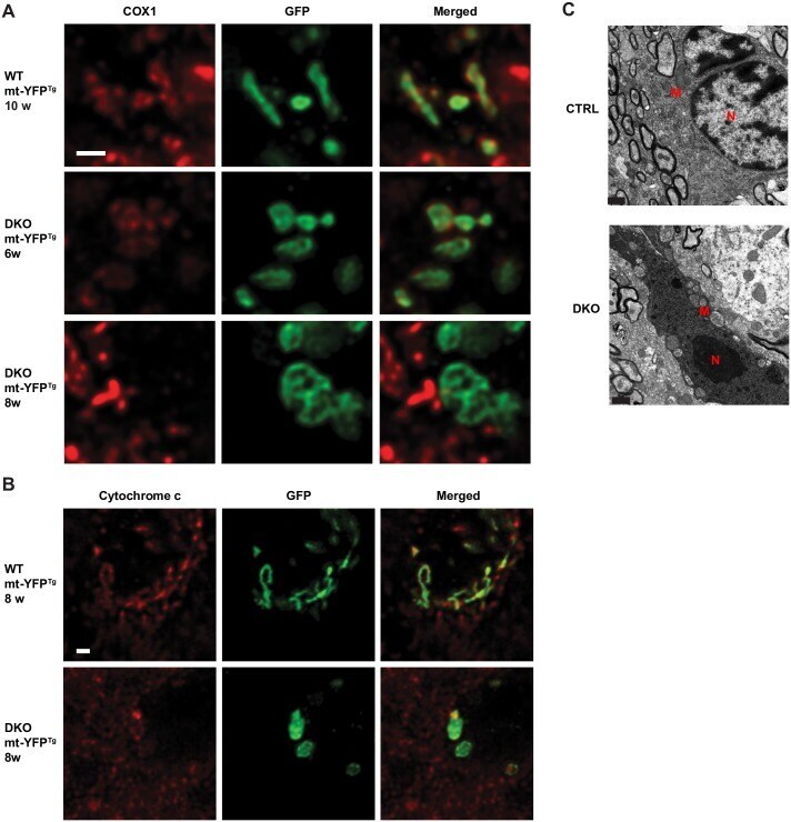 - Fig 6 Loss of the m -AAA protease in oligodendrocytes causes mitochondrial dysfunction and dark cell death. (A) Deconvoluted single-plane confocal images of double immunofluorescence staining of mt-YFP and COX1 in WT and DKO mice at the indicated age. mt-YFP + mitochondria in DKO lose COX1 staining. Scale bar, 1 mum. (B) Deconvoluted single-plane confocal images of double immunofluorescence staining of mt-YFP and cytochrome c in WT and DKO mice at 8 weeks. Scale bar, 1 mum. (C) Ultrastructural analysis shows an oligodendrocyte undergoing dark cell death in the corpus callosum of 8-week-old DKO mice. M: mitochondria; N: nucleus. Scale bar, 1 mum. n = 3 per genotype in all experiments.