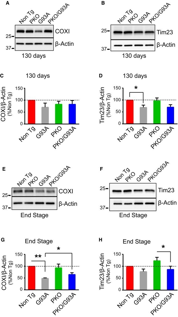 - Figure EV4 Increased mitochondrial protein turnover in G93A mice is attenuated by Parkin knockout A, B Western blots of COXI (A) and Tim23 (B) in spinal cord homogenates at 130 days. C Quantification of COXI at 130 days with beta-actin as a normalizer. Results are expressed as mean +- SEM and as percent of Non Tg; n = 8 (four males and four females) mice per group. No statistically significant differences were found between G93A and PKO/G93A ( P = 0.493 by paired Student's t -test). D Quantification of Tim23 at 130 days, using beta-actin as loading control, showed decreased levels of Tim23 in G93A mice. Results are expressed as mean +- SEM and as a percent of Non Tg; n = 8 (four males and four females) mice per group. No statistically significant differences were found between G93A and PKO/G93A ( P = 0.921 by paired Student's t -test). * P = 0.035 (Non Tg Vs. G93A) by paired Friedman's test with Dunn's correction. No other statistically significant differences were found. E, F Representative Western blots of COXI (E) and Tim23 (F) in disease end-stage homogenates. G Quantification of COXI at disease end stage using beta-actin as loading control. Results are expressed as mean +- SEM and as percent of Non Tg; n = 5 (three males and two females) mice per group. * P = 0.047 for (G93A and PKO/G93A) by paired Student's t -test; ** P = 0.0018 by paired Friedman's test with Dunn's correction (Non Tg vs. G93A). H Quantification of Tim23 with beta-actin as normalizer