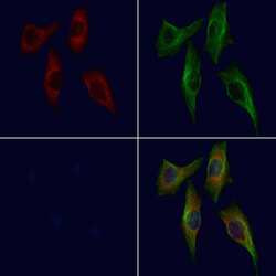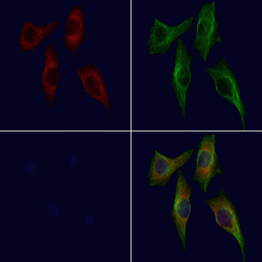 - Immunofluorescent analysis of BSSP4 in 3T3 cells. Samples were fixed with paraformaldehyde, permeabilized with 0.1% Triton X-100, blocked with 10% serum (45 min at 25°C), incubated with mouse anti-beta tubulin and BSSP4 polyclonal antibody (Product # PA5-103666) using a dilution of 1:200 (1 hr, 37°C), and followed by goat anti-rabbit IgG Alexa Fluor 594 (red) and goat anti-mouse IgG Alexa Fluor 488 (green).