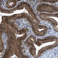 - Immunohistochemical staining of human gall bladder shows cytoplasmic and nuclear positivity in glandular cells.