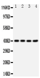 - WB of CXCR1 antibody. Lane 1: HELA Cell Lysate. Lane 2: COLO320 Cell Lysate. Lane 3: M231 Cell Lysate. Lane 4: HT1080 Cell Lysate.
