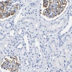 - Immunohistochemical staining of human kidney shows membranous positivity in glomeruli.