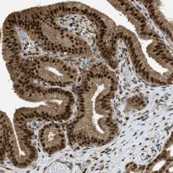 - Immunohistochemical staining of human gall bladder shows nuclear and cytoplasmic positivity in glandular cells.
