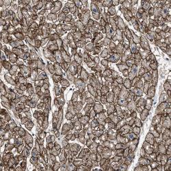 - Immunohistochemical staining of human heart muscle shows membranous positivity in myocytes.