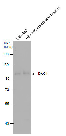 - DAG1 antibody detects DAG1 protein by western blot analysis. U87-MG whole cell extracts and membrane extracts (30 ?g) were separated by 7.5% SDS-PAGE, and the membrane was blotted with DAG1 antibody (GTX105038) diluted at 1:500. The HRP-conjugated anti-rabbit IgG antibody (GTX213110-01) was used to detect the primary antibody.