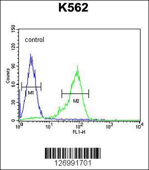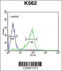 - GLP1 Antibody (Center) (Cat. #AP5500c) flow cytometric analysis of K562 cells (right histogram) compared to a negative control cell (left histogram).FITC-conjugated goat-anti-rabbit secondary antibodies were used for the analysis.
