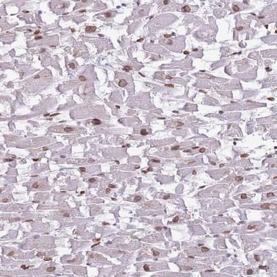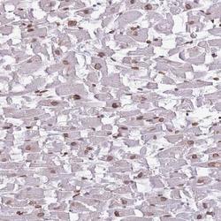 - Immunohistochemistry-Paraffin: ZGLP1 Antibody [NBP2-13548] - Staining of human heart muscle shows moderate nuclear membrane positivity in myocytes.