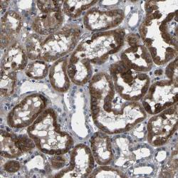 - Immunohistochemical staining of human kidney shows cytoplasmic positivity in renal tubules.
