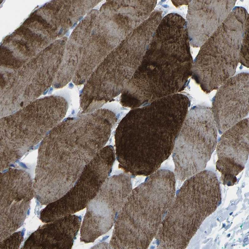 - Immunohistochemical staining of human skeletal muscle shows distinct positivity in myocytes.