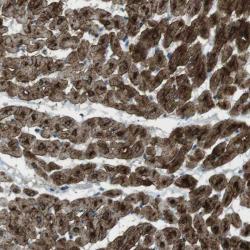 - Immunohistochemical staining of human heart muscle shows distinct cytoplasmic and membranous positivity in myocytes.