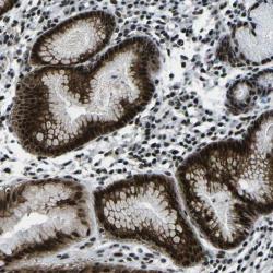 - Immunohistochemical staining of human stomach shows strong nuclear positivity in glandular cells.