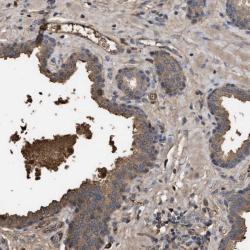- Immunohistochemical staining of human prostate shows cytoplasmic and extracellular material positivity in glandular cells.