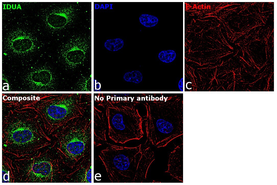 - Immunofluorescence analysis of IDUA was performed using 70% confluent log phase A549 cells. The cells were fixed with 4% paraformaldehyde for 10 minutes, permeabilized with 0.1% Triton™ X-100 for 15 minutes, and blocked with 2% BSA for 1 hour at room temperature. The cells were labeled with IDUA sheep Polyclonal Antibody (Product # PA5-47583) at 5 µg/mL in 0.1% BSA, incubated at 4 degree Celsius overnight and then labeled with Donkey anti-Sheep IgG (H+L) Cross-Adsorbed Secondary Antibody, Alexa Fluor 488 (Product # A-11015) at a dilution of 1:2000 for 45 minutes at room temperature (Panel a: green). Nuclei (Panel b: blue) were stained with ProLong™ Diamond Antifade Mountant with DAPI (Product # P36962). F-actin (Panel c: red) was stained with Rhodamine Phalloidin (Product # R415). Panel d represents the merged image showing cytoplasmic (Lysosomal pattern) localization. Panel e represents control cells with no primary antibody to assess background. The images were captured at 60X magnification.