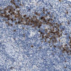 - Immunohistochemical staining of human lymph node shows strong cytoplasmic positivity in lymphoid cells outside reaction centra.