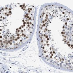 - Immunohistochemical staining of human testis shows strong positivity in spermatids.