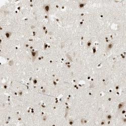 - Immunohistochemical staining of human cerebral cortex shows strong nuclear positivity in neuronal and glial cells.