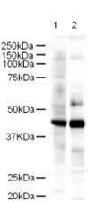 - Western blot using GeneTex's Affinity Purified anti-LDB2 antibody shows detection of a 43-kDa band corresponding to LDB2 in a lysates prepared from human kidney (lane 1) and mouse spleen (lane 2) tissues. Approximately 18 µg of lysate was run on a SDS-PAGE and transferred onto nitrocellulose followed by reaction with a 1:500 dilution of anti-LDB2 antibody. Detection occurred using a 1:5,000 dilution of HRP-labeled Goat anti-Rabbit IgG for 1 hour at room temperature. A chemiluminescence system was used for signal detection (Roche) using a 1 min exposure time.