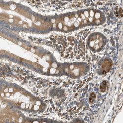 - Immunohistochemical staining of human duodenum shows moderate cytoplasmic positivity in glandular cells.