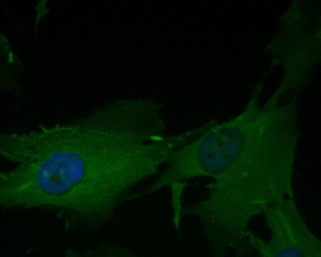 - Immunocytochemical analysis of eIF3b in MG-63 cells using a eIF3b monoclonal antibody (Product #MA5-36159). Formalin fixed cells were permeabilized with 0.1% Triton X-100 in TBS for 10 minutes at room temperature and blocked with 1% Blocker BSA for 15 minutes at room temperature. Cells were probed with the primary antibody for 1 hour at room temperature, washed with PBS. Alexa Fluor®488 Goat anti-Rabbit IgG was used as the secondary antibody at 1:1,000 dilution. The nuclear counter stain is DAPI.