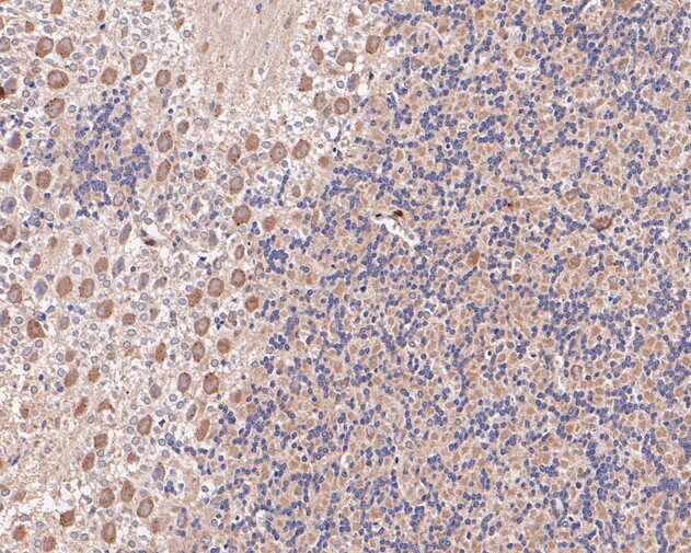 - Immunohistochemical analysis of eIF3b in paraffin-embedded rat cerebellum tissue using a monoclonal antibody (Product #MA5-36159). The section was pre-treated using heat mediated antigen retrieval with Tris-EDTA buffer (pH 8.0-8.4) for 20 minutes. The tissues were blocked in 5% BSA for 30 minutes at room temperature, washed with ddH2O and PBS, and then probed with the primary antibody (1:200) for 30 minutes at room temperature. The detection was performed using an HRP conjugated compact polymer system. DAB was used as the chromogen. Tissues were counterstained with hematoxylin and mounted with DPX.