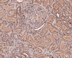 - Immunohistochemical analysis of eIF3b in paraffin-embedded human kidney tissue using a monoclonal antibody (Product #MA5-36159). The section was pre-treated using heat mediated antigen retrieval with Tris-EDTA buffer (pH 8.0-8.4) for 20 minutes. The tissues were blocked in 5% BSA for 30 minutes at room temperature, washed with ddH2O and PBS, and then probed with the primary antibody (1:50) for 30 minutes at room temperature. The detection was performed using an HRP conjugated compact polymer system. DAB was used as the chromogen. Tissues were counterstained with hematoxylin and mounted with DPX.