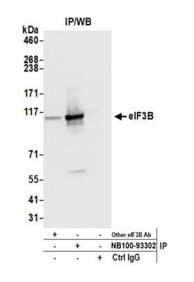 - Immunoprecipitation: EIF3B Antibody [NB100-93302] - Detection of human eIF3B by western blot of immunoprecipitates. Samples: Whole cell lysate (1.0 mg per IP reaction; 20% of IP loaded) from HeLa cells prepared using NETN lysis buffer. Antibodies: Affinity purified rabbit anti-eIF3B antibody NB100-93302 used for IP at 3 ug per reaction. eIF3B was also immunoprecipitated by another rabbit anti-eIF3B antibody. For blotting immunoprecipitated eIF3B, NB100-93302 was used at 1 ug/ml. Detection: Chemiluminescence with an exposure time of 3 seconds.