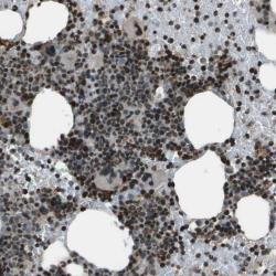- Immunohistochemical staining of human bone marrow shows strong nuclear positivity in bone marrow poietic cells.