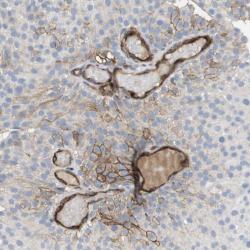 - Immunohistochemical staining of human urothelial cancer shows strong cytoplasmic positivity in endothelial cells.