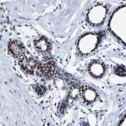 - Immunohistochemical staining of human breast shows nuclear positivity in glandular cells.