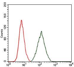 - FACS analysis of A431 cells using RAP1A antibody [5F8] (green) or a negative control (red).