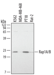 - Detection of Human/Mouse/Rat Rap1A/B by Western Blot. Western blot shows lysates of K562 human chronic myelogenous leukemia cell line, MDA-MB-468 human breast cancer cell line, PT18 mouse mast/basophil cell line, and Rat-2 rat embryonic fibroblast cell line. PVDF membrane was probed with 1 µg/mL Human/Mouse/Rat Rap1A/B Antigen Affinity-purified Polyclonal Antibody (Catalog # AF3767) followed by HRP-conjugated Anti-Goat IgG Secondary Antibody (Catalog # HAF017). A specific band for Rap1A/B was detected at approximately 22 kDa (as indicated). This experiment was conducted under reducing conditions and using Immunoblot Buffer Group 1.