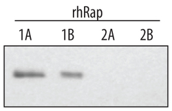 - Detection of Human Rap1A/B by Western Blot. Western blot shows recombinant human Rap1A, Rap1B, Rap2A, and Rap2B (1 ng/lane). PVDF membrane was probed with 1 µg/mL Human/Mouse/Rat Rap1A/B Antigen Affinity-purified Polyclonal Antibody (Catalog # AF3767) followed by HRP-conjugated Anti-Goat IgG Secondary Antibody (Catalog # HAF017). This experiment was conducted under reducing conditions and using Immunoblot Buffer Group 1.