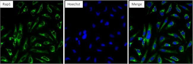 - ICC/IF analysis of HeLa cells using Rap1 antibody [1D2-1C64] at a dilution of 1:100 (green). Nuclei (blue) were stained with Hoechst 33342.