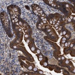 - Immunohistochemical staining of human small intestine shows strong cytoplasmic and membranous positivity in glandular cells.