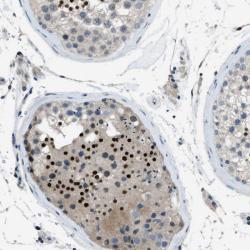 - Immunohistochemical staining of human testis shows strong nuclear positivity in spermatids.