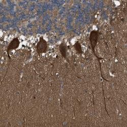 - Immunohistochemical staining of human cerebellum shows strong cytoplasmic positivity in Purkinje cells.