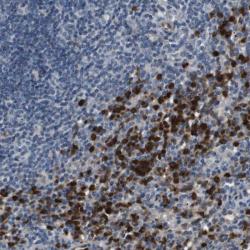 - Immunohistochemical staining of human spleen shows strong positivity in cells of red pulp.