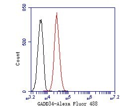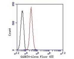 - Flow cytometric analysis of GADD34 using K562 cells and a GADD34 monoclonal antibody (Product #MA5-36129). The cells were fixed, permeabilized and stained with the primary antibody at a dilution of 1:50 (red). After incubation of the primary antibody at room temperature for an hour, the cells were stained with a Alexa Fluor 488-conjugated Goat anti-Mouse IgG Secondary antibody at 1:1000 dilution for 30 minutes. Unlabeled sample was used as a control (cells without incubation with primary antibody; black).