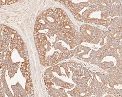 - Immunohistochemical analysis of GADD34 in paraffin-embedded human prostate carcinoma tissue using a monoclonal antibody (Product #MA5-36129). The section was pre-treated using heat mediated antigen retrieval with Tris-EDTA buffer (pH 8.0-8.4) for 20 minutes. The tissues were blocked in 5% BSA for 30 minutes at room temperature, washed with ddH2O and PBS, and then probed with the primary antibody (1:100) for 30 minutes at room temperature. The detection was performed using an HRP conjugated compact polymer system. DAB was used as the chromogen. Tissues were counterstained with hematoxylin and mounted with DPX.