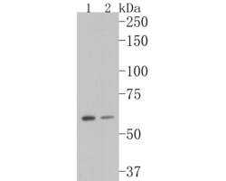 - Western blot analysis of GADD34 using a GADD34 monoclonal antibody (Product #MA5-36129). Proteins were transferred to a PVDF membrane and blocked with 5% BSA in PBS for 1 hour at room temperature. The primary antibody at a dilution of 1:500 was used in 5% BSA at room temperature for 2 hours. Goat Anti-Mouse IgG - HRP Secondary Antibody at 1:5,000 dilution was used for 1 hour at room temperature. Positive control: Lane 1: HepG2 cell lysate, Lane 2: K562 cell lysate