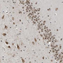 - Immunohistochemical staining of human hippocampus shows nucleolar and cytoplasmic positivity in neuronal cells.
