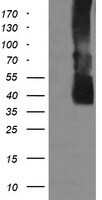 - HEK293T cells were transfected with the pCMV6-ENTRY control (Left lane) or pCMV6-ENTRY MAP2K3 (RC207115, Right lane) cDNA for 48 hrs and lysed. Equivalent amounts of cell lysates (5 µg per lane) were separated by SDS-PAGE and immunoblotted with anti-MAP2K. Positive lysates LY403425 (100 µg) and LC403425 (20 µg) can be purchased separately from OriGene.