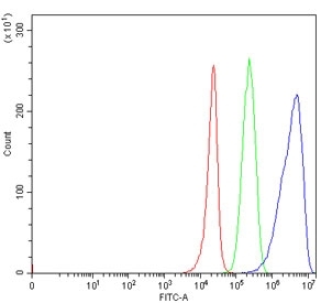 - Flow cytometry testing of human 293T cells with TRMT44 antibody at 1ug/million cells (blocked with goat sera); Red=cells alone, Green=isotype control, Blue= TRMT44 antibody.