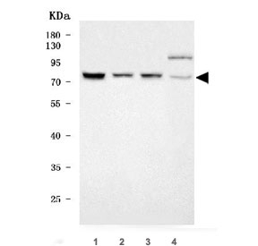 - Western blot testing of human 1) K562, 2) MOLT4, 3) U-251 and 4) HeLa cell lysate with TRMT44 antibody. Predicted molecular weight ~85 kDa.