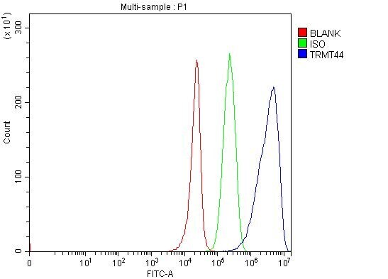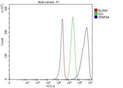 - Flow cytometry of C4orf23 in 293T cells (blue line). The cells were blocked with 10% normal goat serum, and then incubated with C4orf23 polyclonal antibody (Product # PA5-144043) (1 μg/1x10^6 cells) for 30 min at 20°C. Isotype control antibody (Green line) was rabbit IgG (1 μg/1x10^6 cells) used under the same conditions. Unlabeled sample (Red line) was also used as a control. DyLight®488 conjugated goat anti-rabbit IgG (5-10 μg/1x10^6 cells) was used as secondary antibody for 30 minutes at 20°C.
