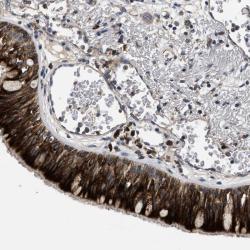 - Immunohistochemical staining of human bronchus shows strong cytoplasmic positivity in respiratory epithelial cells.