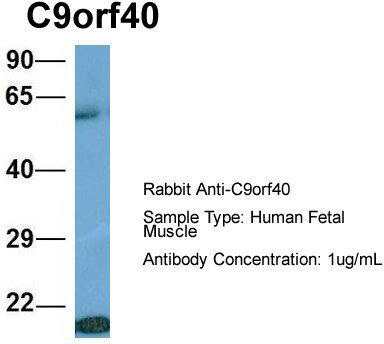 - Host:Rabbit; Target Name:C9orf40; Sample Tissue:Human Fetal Muscle; Antibody Dilution: 1.0 ug/ml