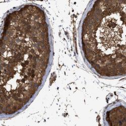 - Immunohistochemical staining of human testis shows cytoplasmic positivity in cells of seminiferus ducts.